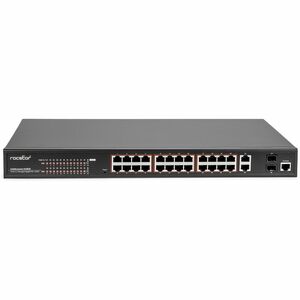 The Rocstor SolidConnect SCM28 L2 Managed PoE+ Switch boasts 24 versatile Gigabit PoE ports (10M/100M/1000M), coupled with one Gigabit RJ45 and two Gigabit SFP transceiver slots for flexible connections. Configured with a robust 400W power supply, it delivers a reliable 30W power for each port, backed by a substantial 370W PoE power budget. Adhering to IEEE 802.3af/at standards, this switch ensures seamless integration into modern networks, supporting diverse applications such as cameras, VoIP, and wireless access points. Tailored for government, businesses, and schools, it meets the demands of those requiring reliable network connectivity.The SCM28 switch integrates an easy-to-use GUI and a simplified user interface for straightforward configuration.
