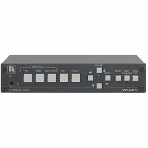 The VP-461 is a high-quality presentation switcher and scaler with PIP for computer graphics, HDMI and DisplayPort signals. It scales the video, embeds the audio and outputs the signal to the HDMI output, as well as to the computer graphics video output together with an unbalanced audio output.
