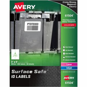 Avery® Surface Safe ID Label - 3" Width x 5" Length - Removable Adhesive - Rectangle - Laser, Inkjet - White - Film - 4 / Sheet - 50 Total Sheets - 200 Total Label(s) - Water Resistant - 200 / Pack