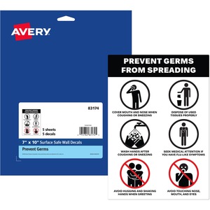 Avery® Surface Safe PREVENT GERMS Wall Decals - Print/Message "Prevents Germs from Spreading" - 7" Width x 10" Height - Rectangular Shape - Water Resistant, Pre-printed, Chemical Resistant, Abrasion Resistant, Tear Resistant, Durable, UV Resistant, Residue-free, Easy Peel, Anti-slip, Stick & Stay, ... - Polyester, Vinyl - Multicolor - 5 / Pack