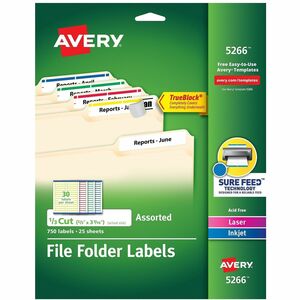 Avery® TrueBlock File Folder Labels - 21/32" Width x 3 7/16" Length - Permanent Adhesive - Rectangle - Laser, Inkjet - Matte - Blue, Green, Red, White, Yellow - Paper - 30 / Sheet - 25 Total Sheets - 750 Total Label(s) - Permanent Adhesive, Stick & Stay, Jam Resistant, Reusable - 750 / Pack